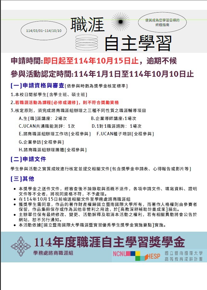 歡迎申請本組職涯自主學習獎學金,詳細內容請詳閱附件。