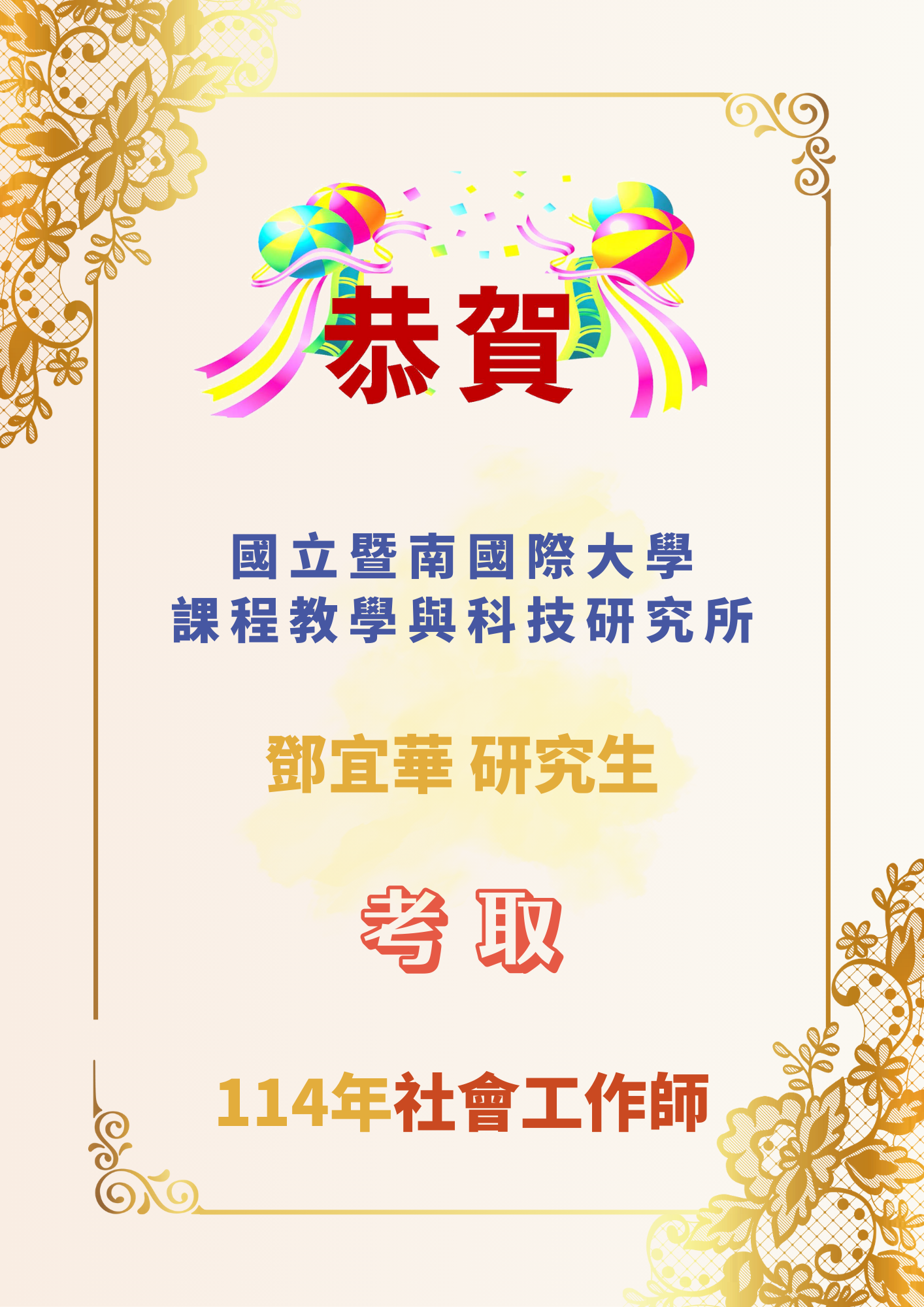 恭賀 本所研究生鄧宜華 考取114年社會工作師