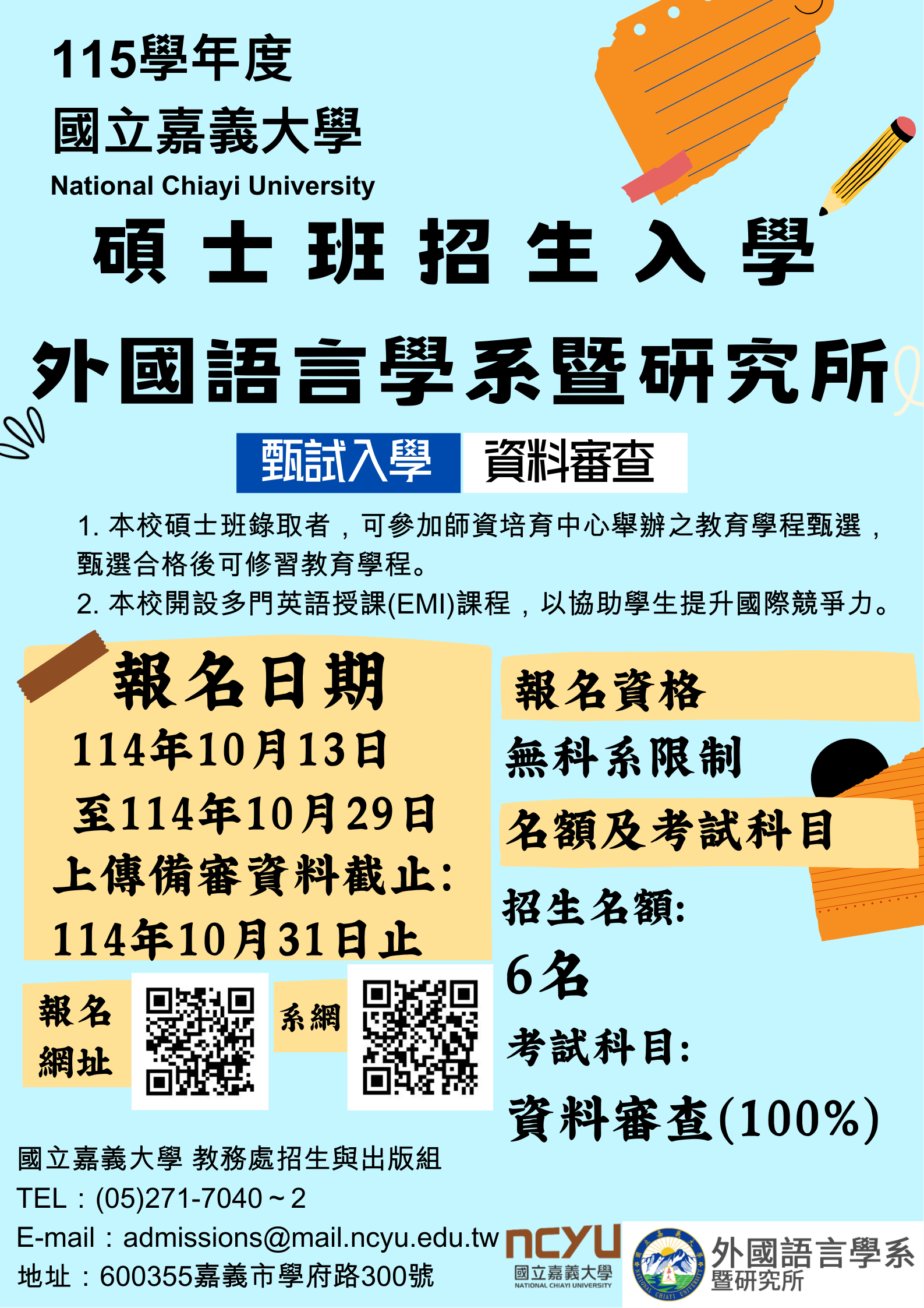 【轉知】【國立嘉義大學外國語言學系暨研究所115學年度碩士班甄試入學招生公告】(報名時間:114/10/13-10/29日下午5時止)