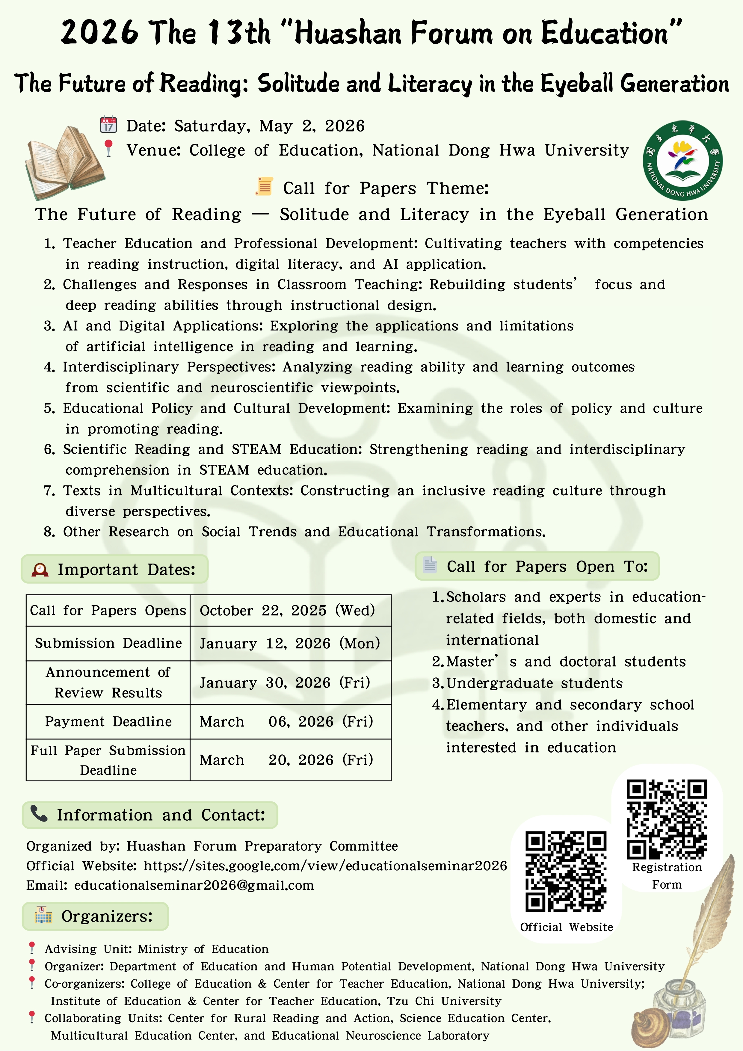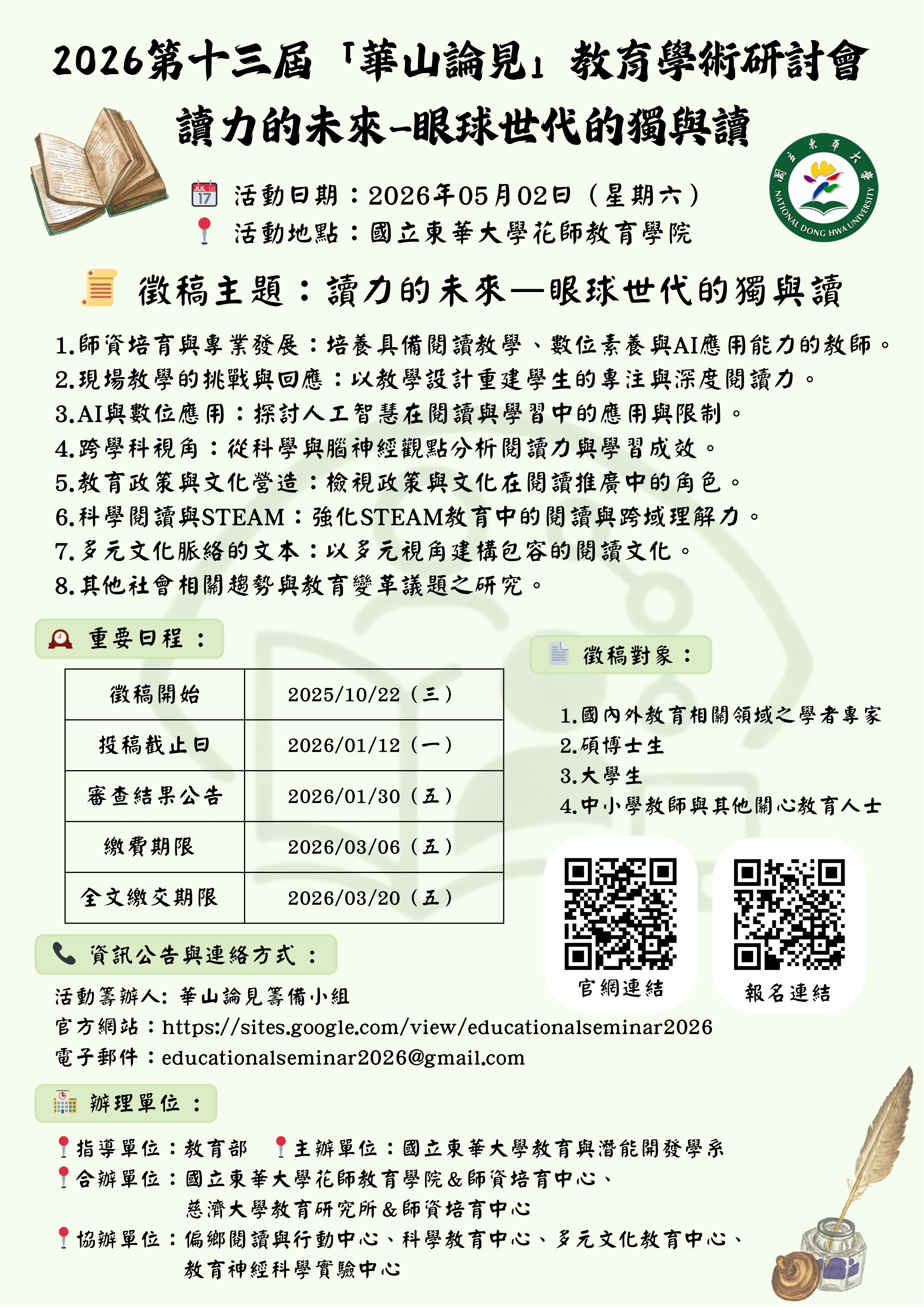 【轉知】【徵稿訊息】國立東華大學函_教育與潛能開發學系舉辦「2026第十三屆華山論見教育學術研討會」徵稿