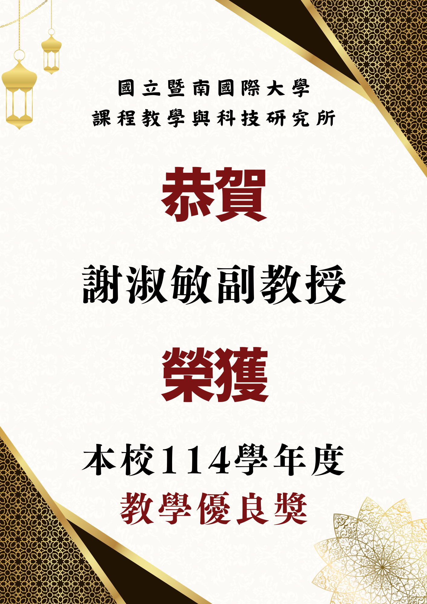 恭賀本所謝淑敏副教授榮獲114年度教學優良獎