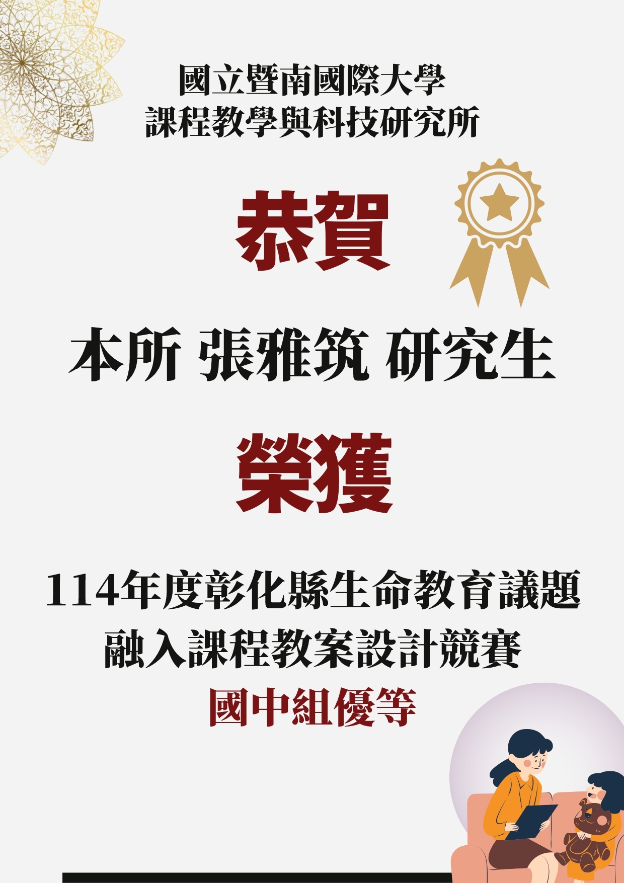 恭賀 本所研究生張雅筑 榮獲114年度彰化縣生命教育議題融入課程教案設計競賽國中組優等