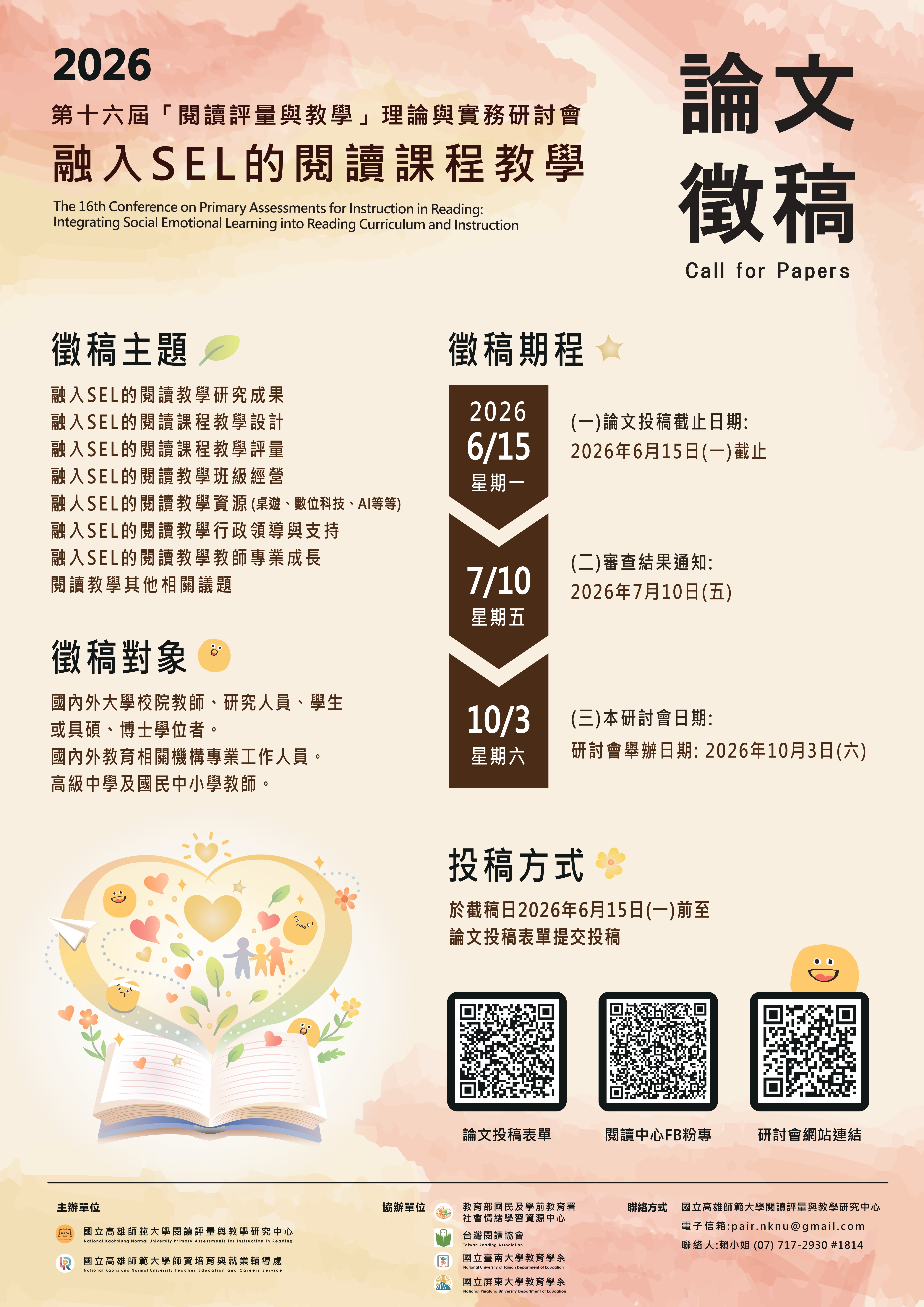 【轉知】徵稿訊息】國立高雄師範大學函_「2026年融入SEL的閱讀課程教學」論文徵稿